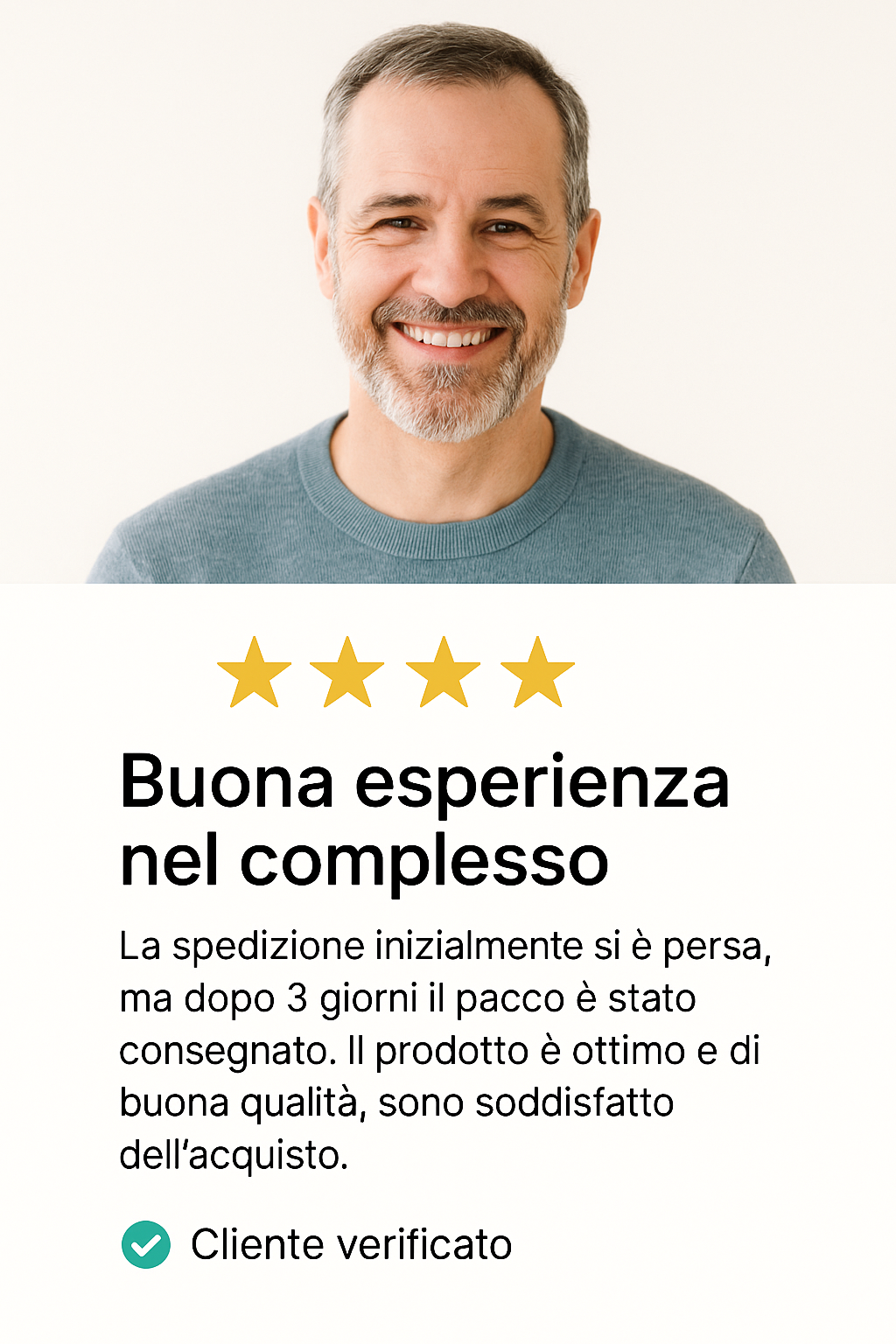 Il prodotto è arrivato nei tempi previsti, ben imballato e in perfette condizioni. La qualità è ottima e ha superato le mie aspettative. Lo consiglio senza dubbio Il prodotto è arrivato nei tempi previsti, ben imballato e in perfette condizioni. La qualità è ottima e ha superato le mie aspettative. Lo consiglio senza dubbio Il prodotto è arrivato nei tempi previsti, ben imballato e in perfette condizioni. La qualità è ottima e ha superato le mie aspettative. Lo consiglio senza dubbio
